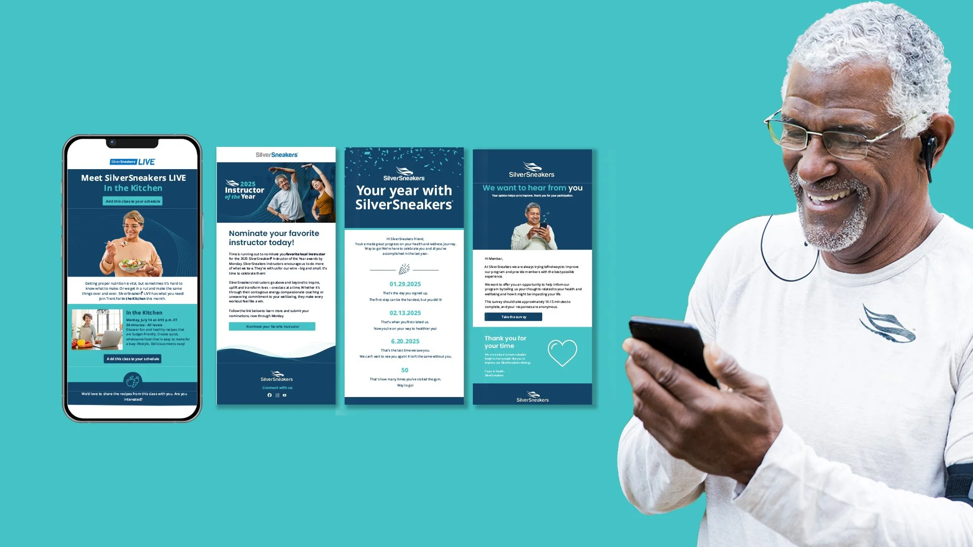 I was very fortunate to be a part of the SilverSneakers rebrand. I was part of the design team that helped modernize the brand via logo, colors, and other graphical elements. Attached are a compilation of varying marketing materials that showcase how we took the new look and feel and implemented it across all of our different channels.